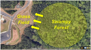 One of the more interesting observations on this day came from a grassy field next to a swampy forest on the east side of one of the schools (see figure below). Winds were light (less than 10 mph) and out of the east, carrying extra moisture from the forest across the field. As a result, dew point temperatures there rose to 72°F, the highest we recorded anywhere during this experiment (by comparison, dew point temperatures at RDU that afternoon were around 65°F). That moisture likely came from the lush vegetation and wet soils resulting from a very humid and rainy summer. From April to July, a nearby CoCoRaHS rain gauge recorded over 21 inches of rain, about 30% more than normal, which meant plenty of water was available for evaporation and transpiration.
