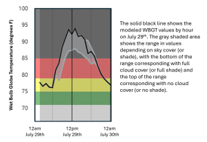 While we didn’t produce a WBGT heat map for this day, our WBGT Prediction Tool showed values near the school peaking around 94°F during the midday hours, conditions that would trigger a black flag warning under any established WBGT guidelines, including those used by the American Academy of Pediatrics (see figure below). This means outdoor activities, especially for young children, should be canceled. Even by the time we started collecting data around 2:15pm, modeled WBGT values were still in the upper 80s. That’s dangerously high for children, and it underscores an important point: regional conditions tell only part of the story. Local conditions and environments, like the mix of sun, shade, pavement, and moisture around a school, can amplify heat stress far beyond what’s measured at the nearest airport or weather station. And if that weren’t enough, playground surfaces like asphalt and rubber can easily become hot enough to cause burns in seconds, especially in direct sunlight.